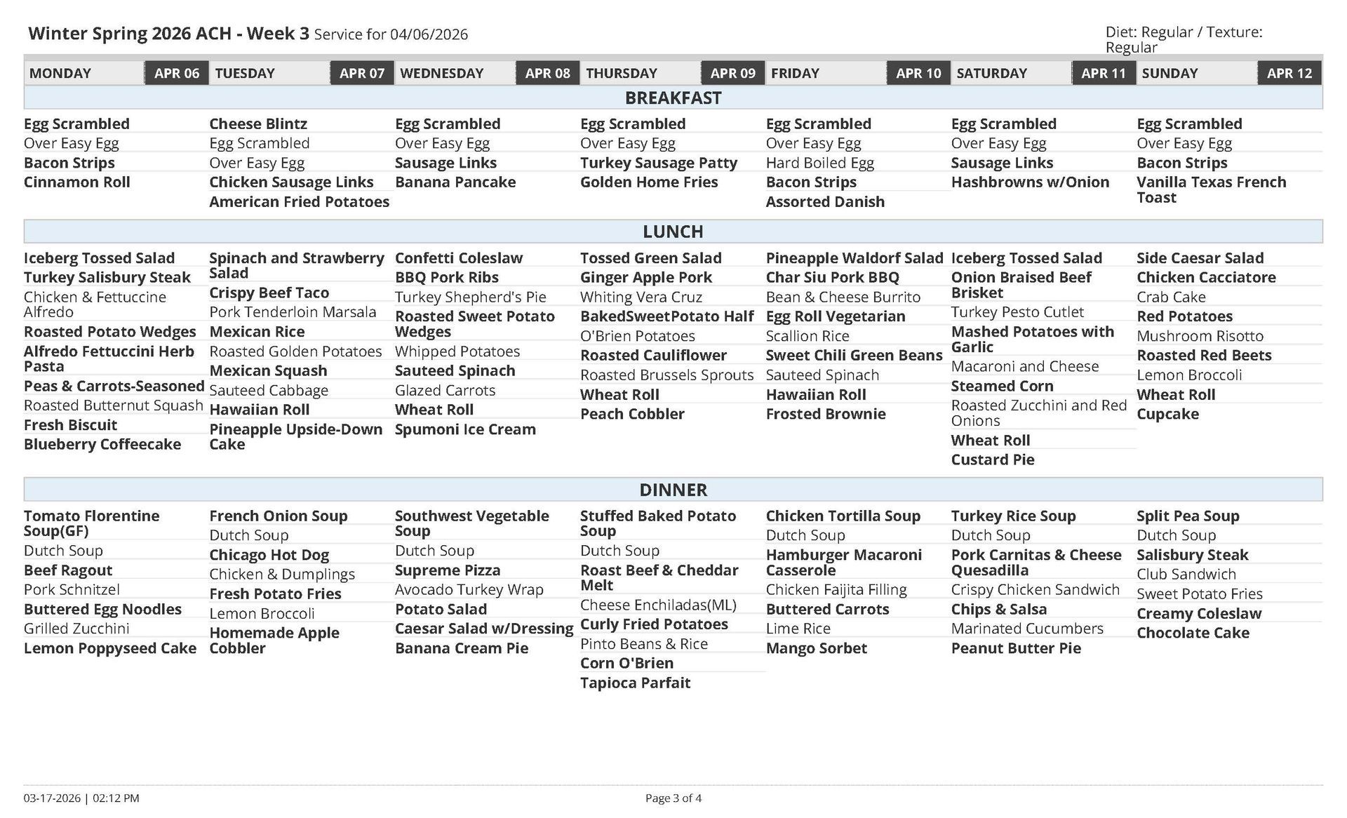 Artesia Christian Home serves a full breakfast along with lighter options such as yogurt, fresh fruit and an assortment of cereals. For lunch and dinner, choose from two entrée selections, a variety of side dishes, and dessert.