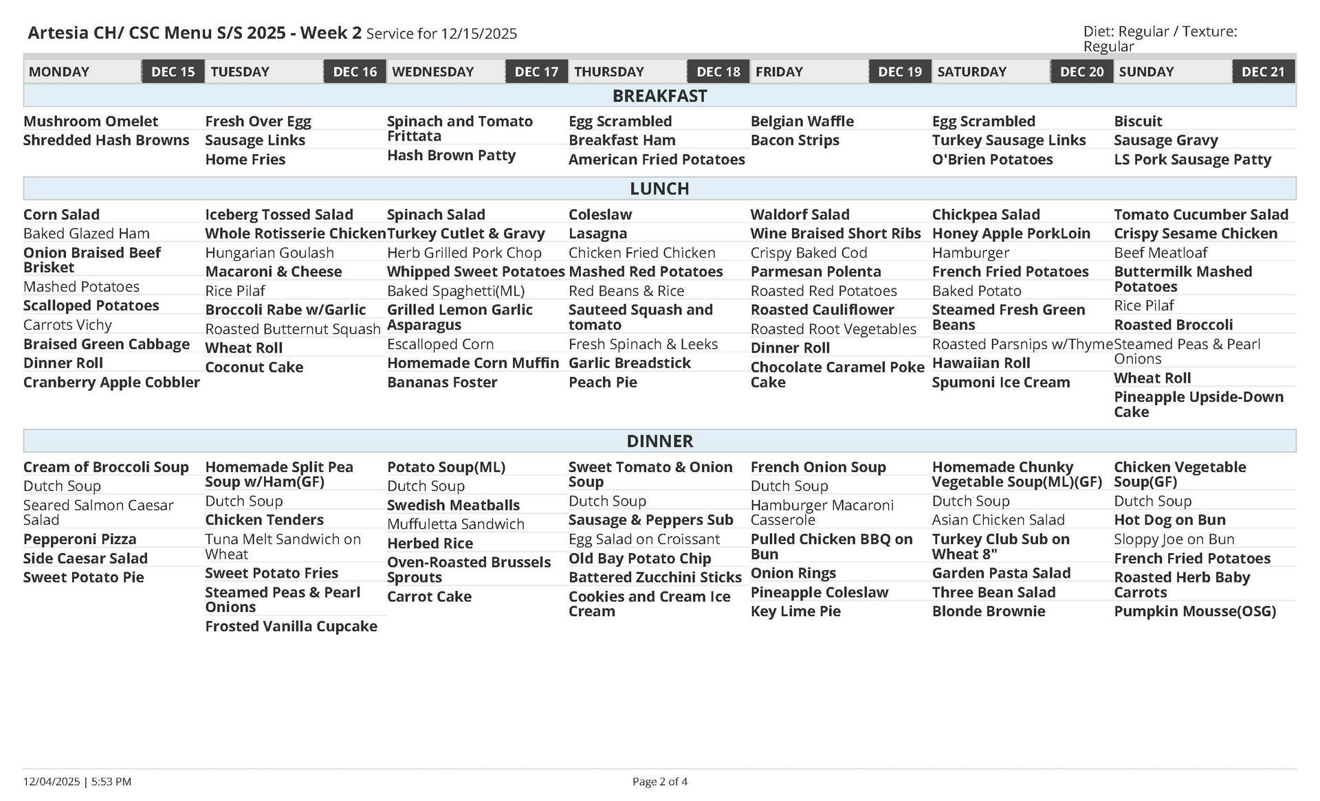 Artesia Christian Home serves a full breakfast along with lighter options such as yogurt, fresh fruit and an assortment of cereals. For lunch and dinner, choose from two entrée selections, a variety of side dishes, and dessert.